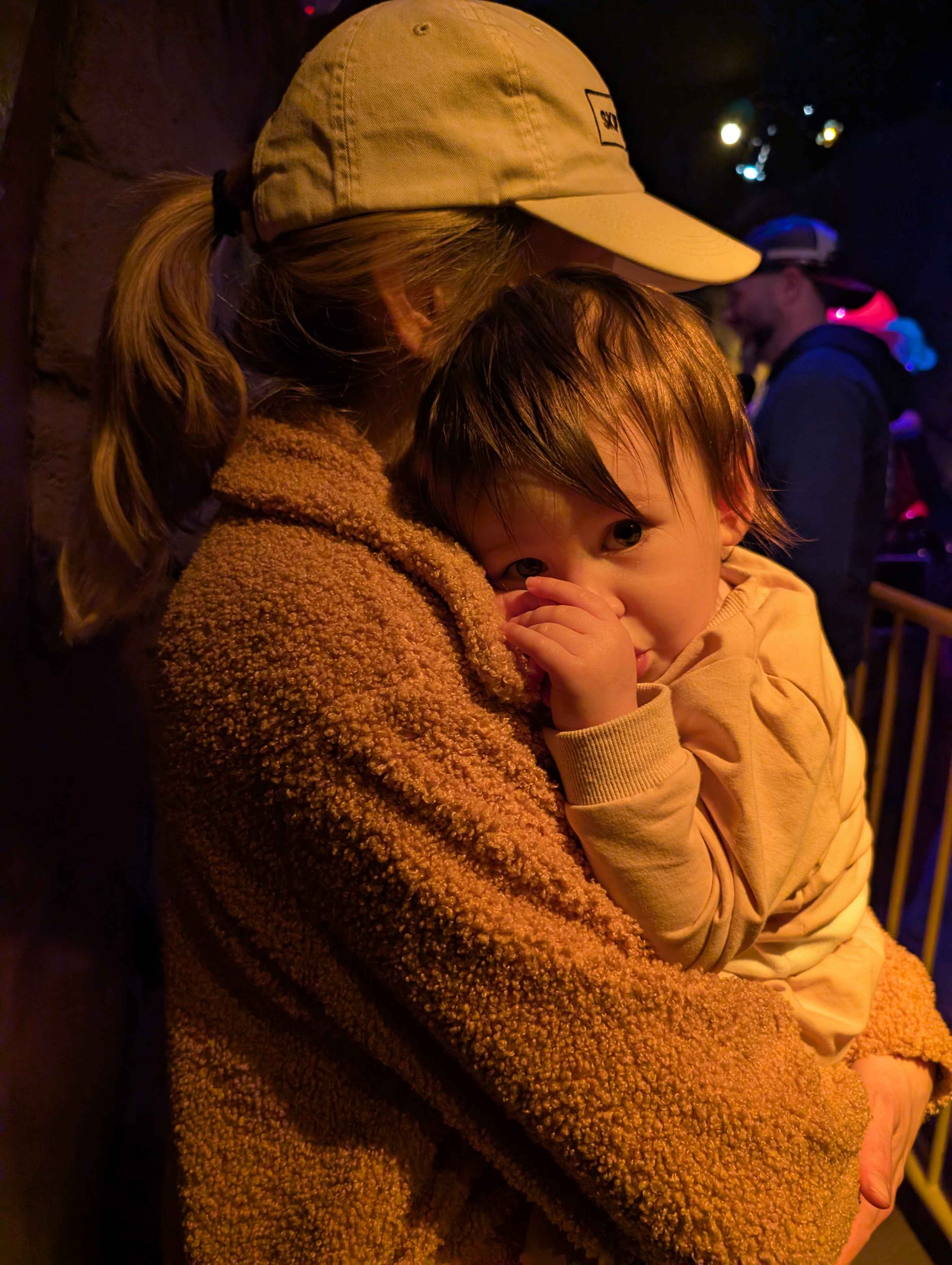 My mom and I took Kenna on the same boat cruise we rode the day before, even with the bad weather looming. After a short line, we boarded the boat and immediately felt a few fat raindrops fall. We considered getting off but thought, how bad could it be? Of course, right as our little boat launched, the skies opened. We were drenched in seconds and poor Kenna kept repeating “uh-oh, uh-oh” as rain splashed down on her tiny head. Luckily a very generous dad let us borrow a spare raincoat that I was able to maneuver around her somewhat as a shield. Nonetheless, she was not happy to be trapped on that boat in the rain.