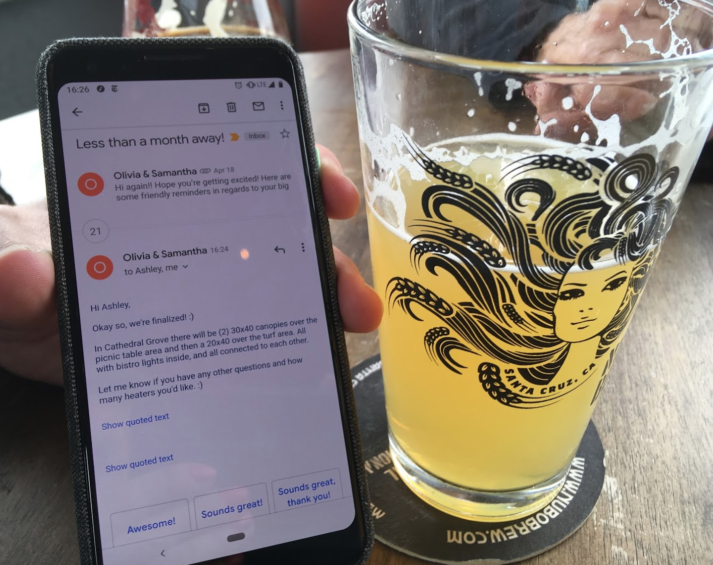 Happily, over pints, we found out that the tents would be, in fact, up for our Friday wedding. Such a relief! The forecast was still calling for a chilly evening, so we upped our heat lamp count and cheers’d.