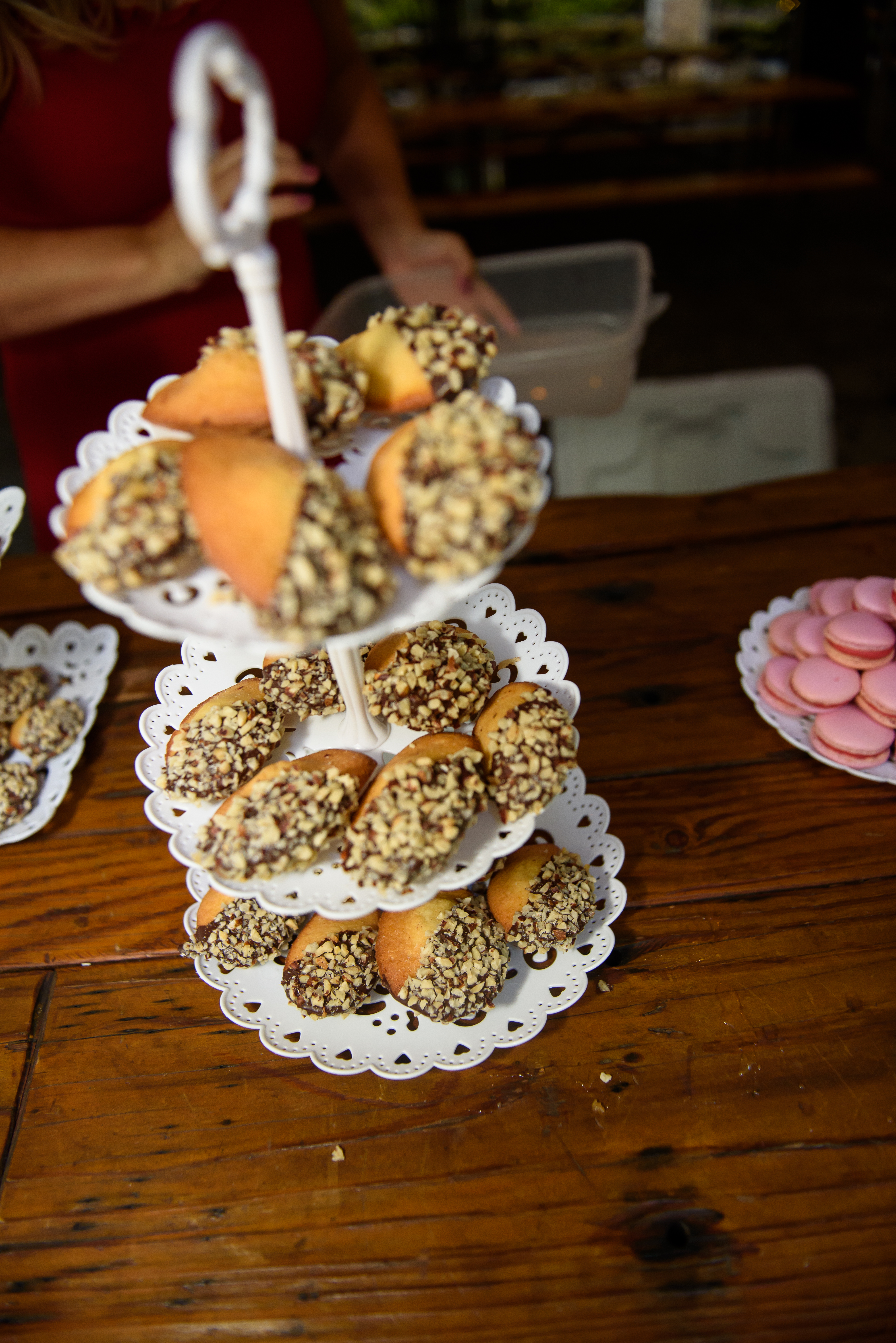 Beautiful Lauren setting up our dessert: madeleines and macaroons that she made for the wedding