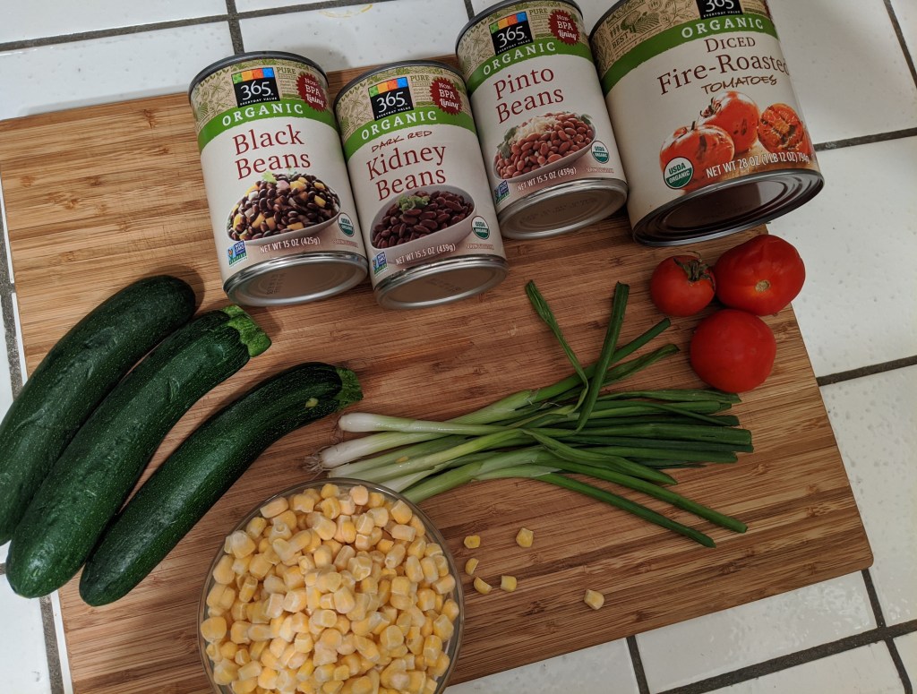 - Add strained and rinsed black beans and kidney beans + chopped zucchini and corn