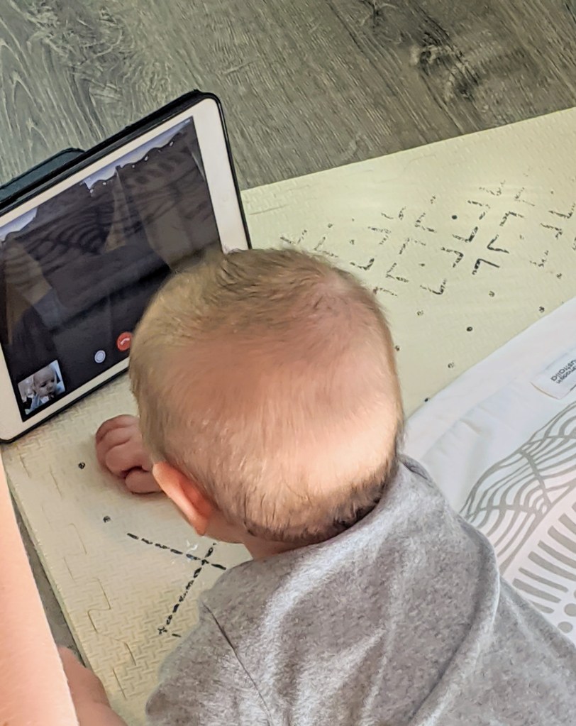 About a week before he turned 5 months he started rolling over from his back to his tummy like a pro. During the first days that he was mastering his new skill, both of our parents and my grandparents were able to see him roll over during our video chats. We would put the iPad behind Cam, up towards the corner of his mat when he was on his back and then the sounds of family encouragement got him to flip every time. It was so special for me to have my dad see him do this on our call because it’s almost impossible to get that man to commit to Factiming. 😉