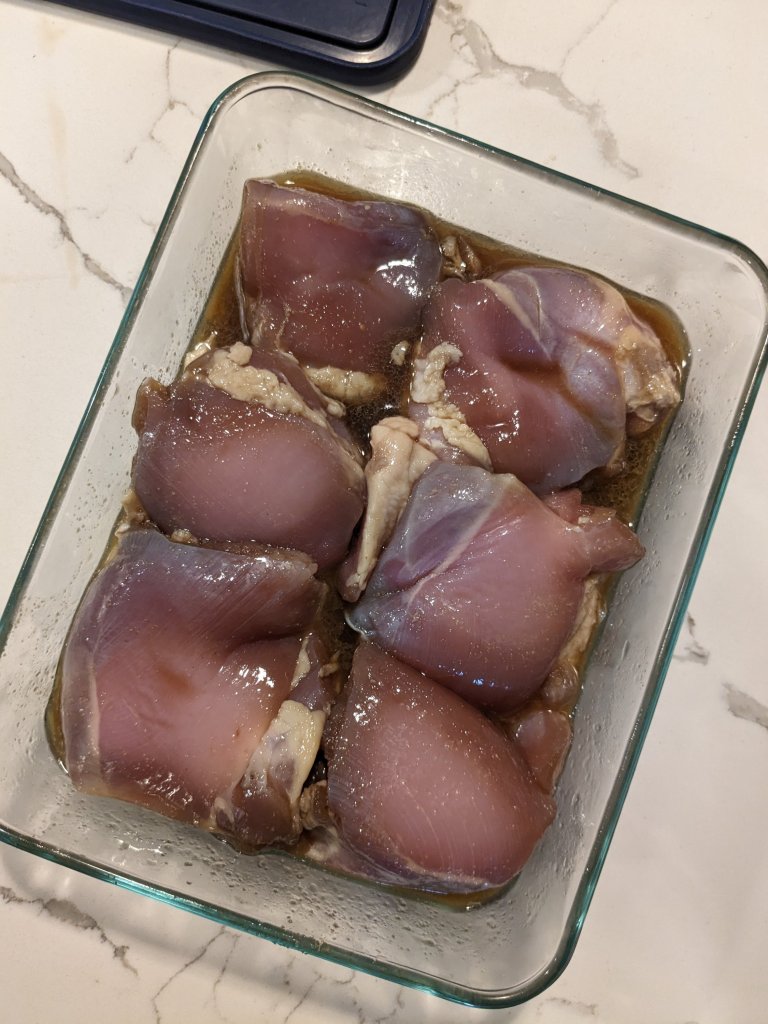 - Place thighs on top of marinade and give them a little wiggle so they really start soaking it in