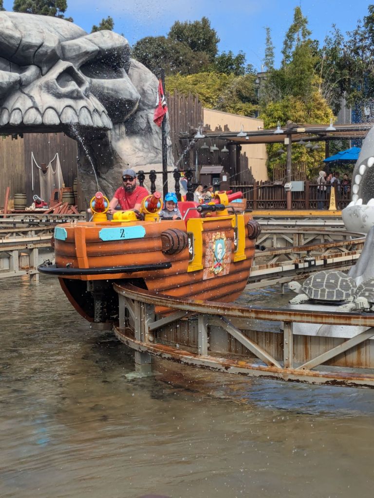 Highlights from our first day included: a “car wash” where Cam got to drive his own car around a track (this was done multiple times); a submarine ride with a treasure hunt for Mike and Cam (while I got to just sit in the dark and relax for a beat lol); the sun finally peeking through enough to enjoy some water play (particularly fun was the pirate ship ride that had water squirters to blast bystanders (yes, they soaked me from the ride); and churros with hot melty chocolate as an afternoon treat (that I insisted we needed 2 orders of – of course we only needed 1…).