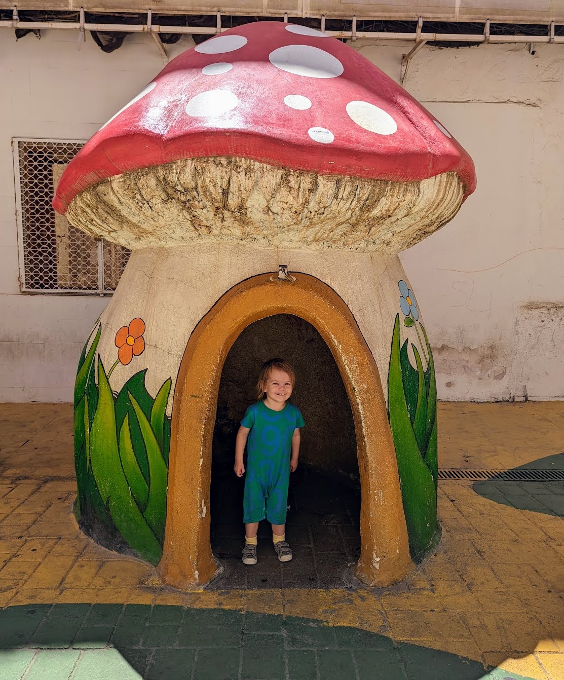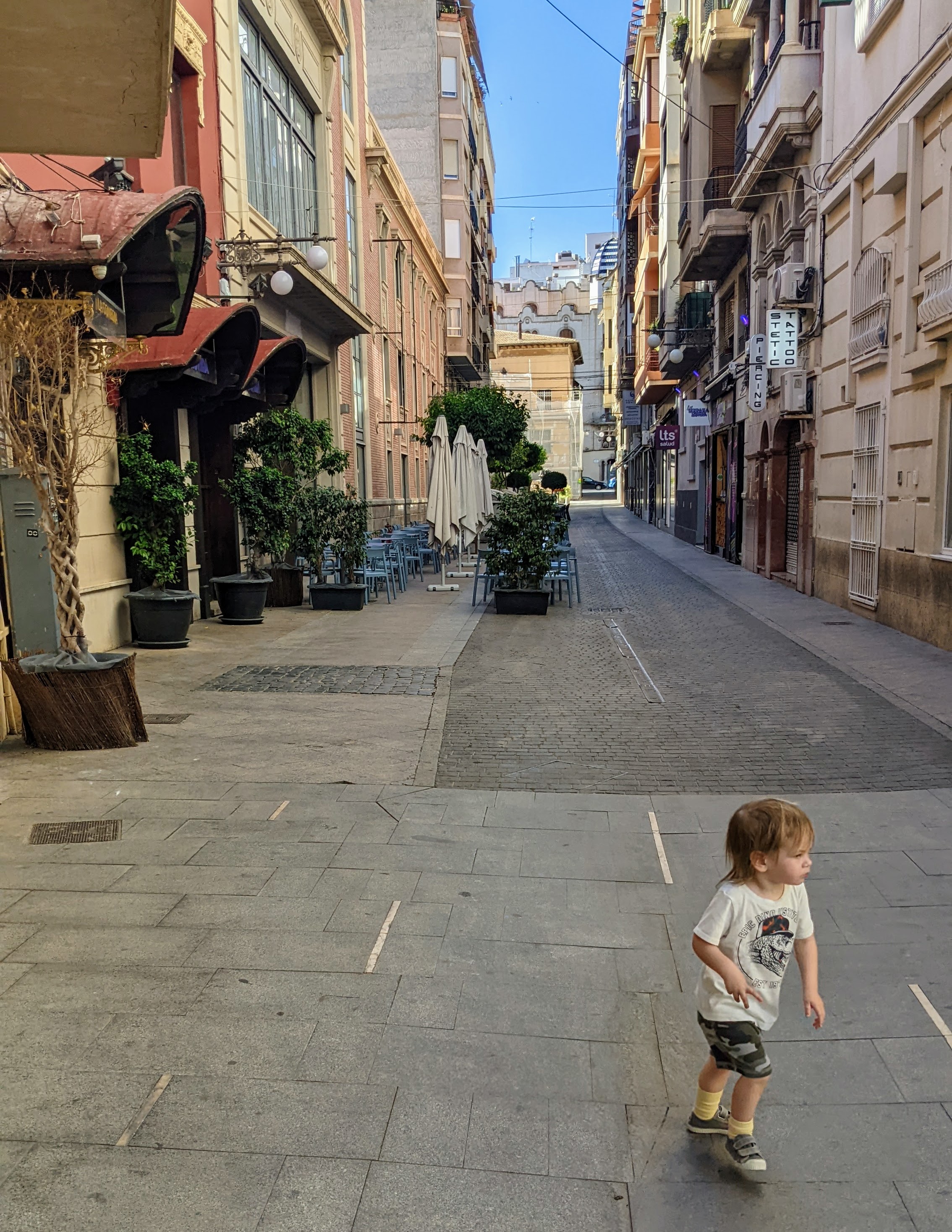 Next up was driving to Javea to meet Mike’s family! On the way we stopped in Alicante proper, which turned out to be a welcome adventure in a more bustling city than the small, tired town we had just spent a few days in. We immediately found a cafe with decent coffee and the best avo and tomato toast (again, ordered in rocky Spanish…). We also walked around this cute pedestrian area, Calle San Francisco, that had giant mushroom statues and tiny toadstool houses for Cam to explore. The vibe in the city was a lot more lively and we had so much fun exploring.